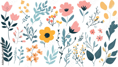 floral, flower, botanical, illustration, watercolor, hand-drawn, drawing, vignetting, art, design, element, clip art, decor, decoration, decorative, pattern, background, spring, summer, garden, nature, organic, leaf, leaf, foliage, stem, pink, yellow, blue, green, orange, white, soft, gentle, pretty, beautiful, romantic, vintage, retro, creative, graphic, isolated, white background, scrapbooking, invitation, greeting card, textile