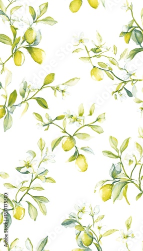Delicate lemon branch watercolor illustration serene organic design seamless background texture perfect for springtime