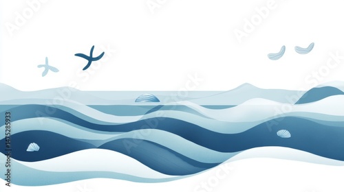 ocean, wave, sea, starfish, seashell, blue, background, nature, marin, calmness, serene, minimalist, paper, cut, design, art, illustration, graphic, abstract, summer, beach, underwater, wildlife, environment, ecosystem, seascape, water, ripple, flow, curve, gradient, texture, pattern, decoration, element, symbol, icon, simple, clean, modern, stylish, creative, artistic, vibrant, peaceful, calming, relaxing, meditation, zen