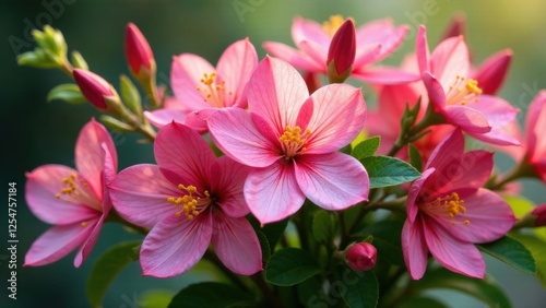 Delicate Pink Blossoms in Soft Sunlight A Close-Up View of a Cluster of Flowers with Vibrant Petals and Golden Centers