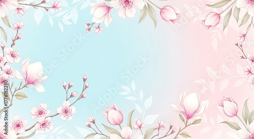 Delicate pink cherry blossom and magnolia branches frame a soft gradient background, evoking spring beauty and renewal for invitations or design.