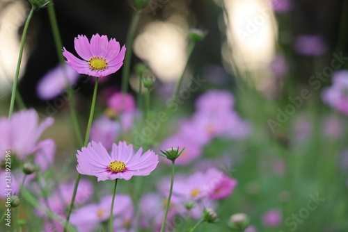 Delicate pink cosmos flowers in a field showcasing their vibrant petals and yellow centers, a beautiful summer scene.