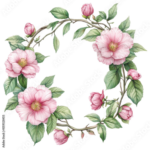 Delicate pink flowers and lush green leaves form beautiful floral wreath, creating serene and inviting atmosphere. This charming design is perfect for various decorative uses