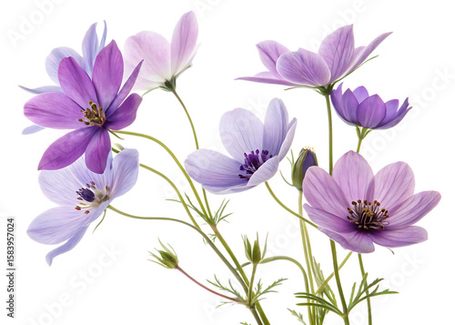 Delicate purple and lavender anemone flowers with detailed centers and green stems isolated on a transparent background