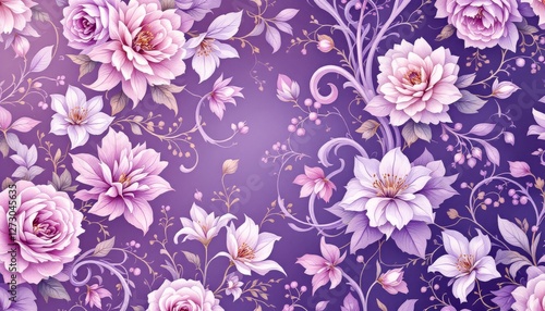 floral, pattern, purple, flower, rose, clematis, lily, vine, ornate, delicate, pastel, watercolor, painting, design, texture, background, wallpaper, fabric, textile, print, illustration, botanical, elegant, romantic, luxurious, soft, dreamy, feminine, beauty, bloom, blossom, flower petals, leaf, stem, bud, art, nature, spring, summer, style, motif, flower, seamless, decoration, pink, leaf, ornament, plant