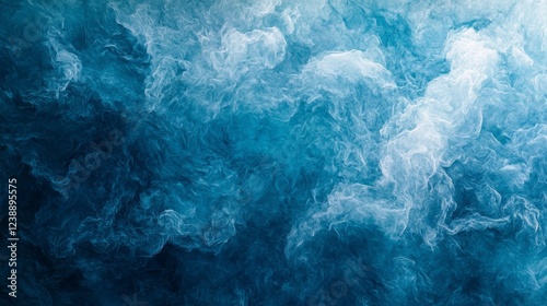 Delicate shades of blue and white intertwine, resembling flowing water or ethereal clouds in an abstract formation. The textures evoke a serene, tranquil feeling, inviting contemplation