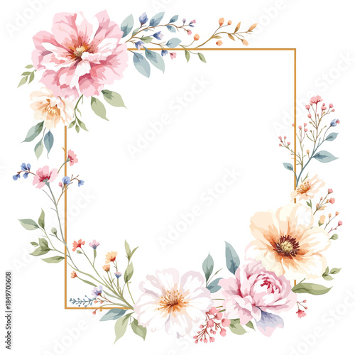 Delicate spring floral composition forming a decorative frame with subtle gold outline and soft watercolor textures