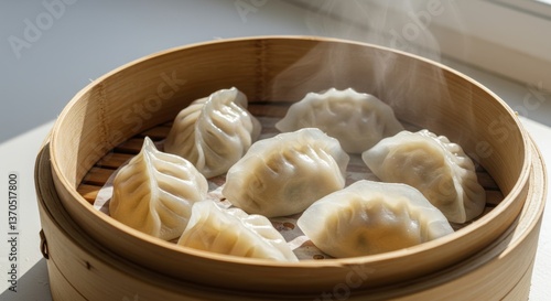 Delicate steamed dumplings in bamboo steamer, bathed in soft natural light