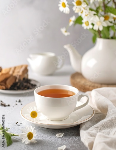 tea, cup, flower, chamomile, cream, teapot, sweet, still life, white, table, cosy, breakfast, morning, relaxing, drink, gentle, pretty, rustic, natural, elegant, warm, delicious, home, simple, refined