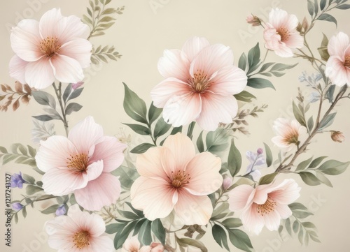 Delicate watercolor blooms on ivory background, botanical prints, floral motifs