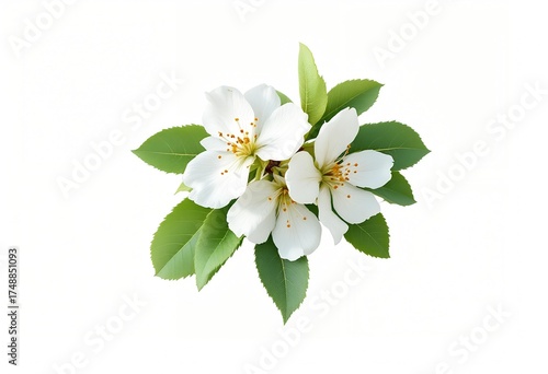 Delicate White Apple Blossoms with Green Leaves Isolated.