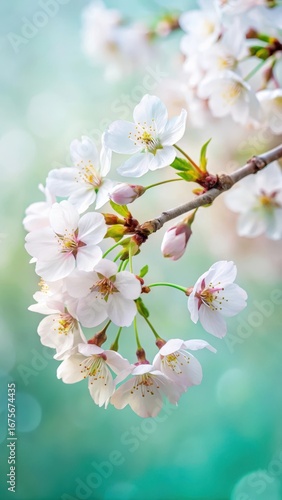 Delicate white cherry blossoms on a branch in full bloom