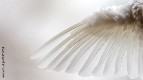 Delicate white feather wing detail, pristine and softly illuminated from above.