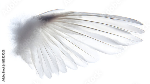 Delicate white feather wing detail, pristine and softly illuminated from above.