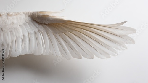 Delicate white feather wing detail, pristine and softly illuminated from above.