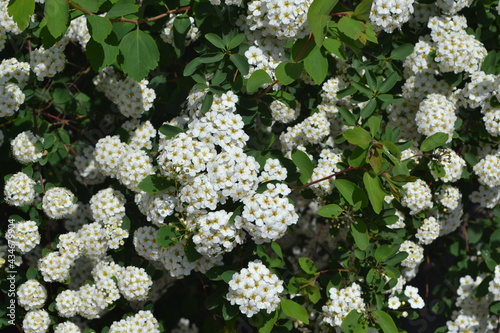 Delicate white flowers. Spirea Wangutta. Beautiful background of nature