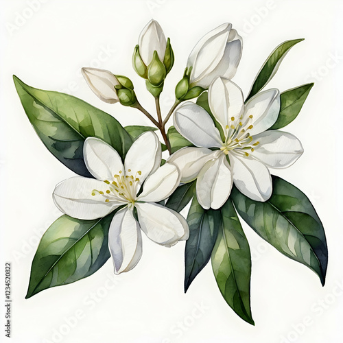 delicate white jasmine flower branch in watercolor, a portrait of elegance and tranquility on white background