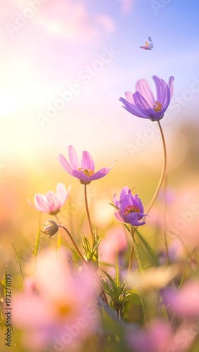 flower, spring, sunlight, purple, pink, gentle, nature, beautiful, delicate, wild, bloom, soft, outdoors, pastel, beauty, flora, botanical, sunrise, field, soft focus