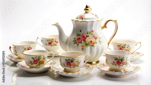 Delicately arranged antique tea set, adorned with floral patterns, stands alone on a crisp white background, evoking warmth and serenity in a minimalist atmosphere.