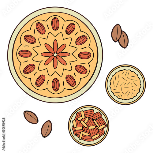 almond, date, dessert, platter, sweet, food, pastry, baked goods, treat, ramadan, eid, middle eastern, cookery, floral, pattern, topview, overhead, illustration, vector, graphic, design, colourful, tasty, delicious