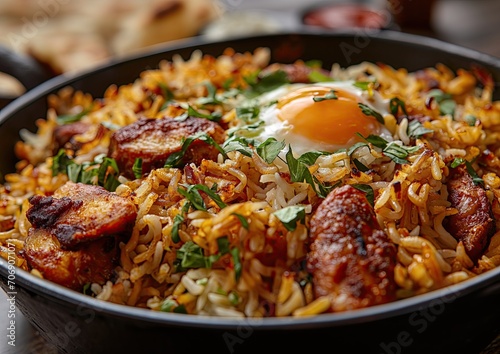 Delicious and Flavorful Indian Cuisine: Close-Up Hyper-Realistic Photo of Aromatic Biryani Dish with Basmati Rice, Chicken, and Traditional Spices