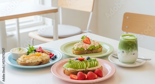 breakfast, brunch, food, healthy, cafes, cafes, modern, bright, clean, fresh, delicious, alimentary, meal, dining, table, toast, bread, fruit, berry, strawberry, blueberry, raspberry, green tea, latte art, vegetarian, epicure, culinary, morning, light, vibrant, colourful, aesthetic, lifestyle, eating, eatery, menu, snack, healthy eating, food photography, no people