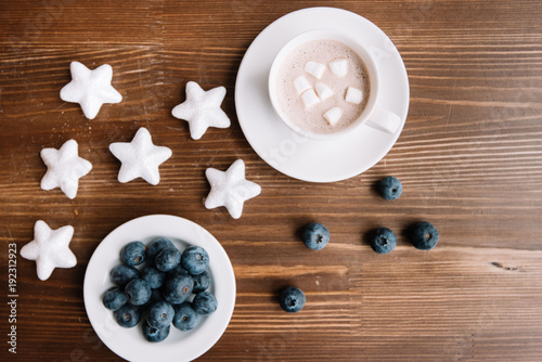 Delicious and healthy fresh blueberries with a cup of hot chocolate topped with marshmallow on the wooden table background, winter flower bouquet in a vase