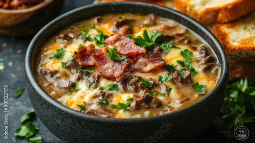 Delicious and hearty philly cheesesteak soup, garnished with crispy bacon and fresh parsley, served in a rustic bowl, perfect for a comforting meal