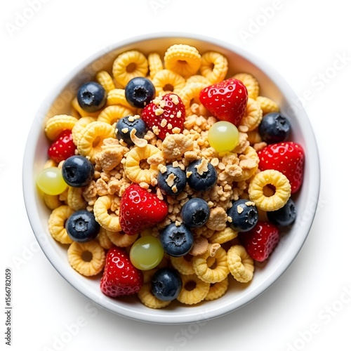 cereal, breakfast, bowl, fruit, berry, blueberry, strawberry, grape, granola, healthy, alimentary, food, healthy eating, children, vitamin, diet, snack, morning meal, appetising, colourful, yellow, red, blue, green, closeup, studio shot, food photography, balanced diet, wholesome, morning, delicious, healthy snack, fresh fruit, diet food, nourishment, children, family, isolated, white background, topview