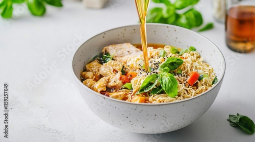 Delicious Asian Broth Being Poured into a Bowl of Noodles with Fresh Vegetables, Chicken, and Herbs Set Against a Light Background