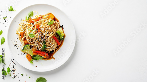 Delicious Asian noodles with vegetables and sesame seeds on a white plate.