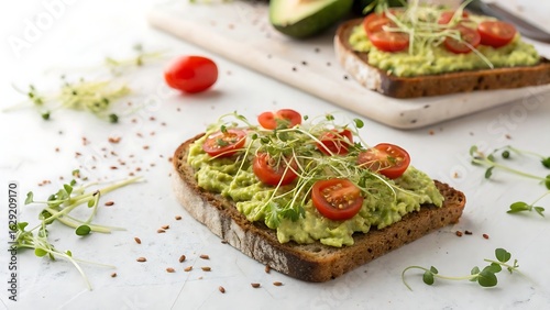 Delicious avocado toast with cherry tomatoes and microgreens on rustic bread