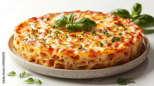 Delicious baked pasta dish topped with cheese and fresh basil, perfect for family dinners or gatherings.