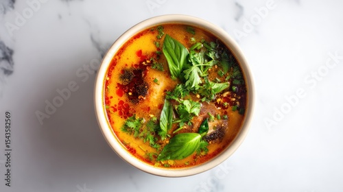 Delicious bowl of aromatic soup garnished with fresh herbs, spices, and vibrant colors on a marble countertop, perfect for culinary photography and food blog features.