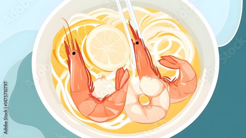 bowl, noodle, shrimp, lemon, soup, food, dish, asian, white, pale, light, yellow, orange, red, pink, tasty, delicious, healthy, seafood, china, chinaware, porcelain, spoon, fork, chopstick, kitchen, eatery, plate, top, view, fresh, hot, comfort, meal, ingredient, alimentary, simple, bright, art, drawing, illustration, graphic, design, modern, digital