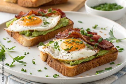 breakfast, egg, bacon, toast, avocado, herb, receipe, morning, meal, culinary, delicious, food, brunch, crispy, garnish, nourishment, comfort, epicure, homemade, dining, savoury, decadence, favor, presentation, vegetable, green, simple, quick, fresh, balanced, sharing, plate, cookery, home, preparation, favor, idea, art, generative, ai