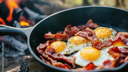 breakfast, egg, bacon, frying pan, cooking, campfire, food, meal, rustic, tasty, frying, sizzle, delicious, kitchen, brunch, morning, ingredient, heat, epicure, grill, nature, travel, picnic, fresh, sunny, yolk, hospitality, cookery, savoury, preparation, countryside, homemade, casual attire, temperature, smoke, appetising, favor, enjoyment, nourishment, protein, happiness, gathering, comfort, warm, dish, frying pan, cast iron