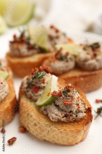 Delicious bruschettas with pate, lime and spices on light table, closeup