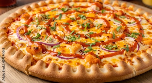 Delicious buffalo chicken pizza with red onions and barbecue sauce for dinner