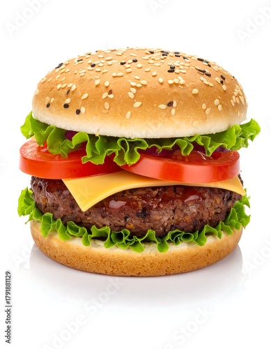 Delicious burger with sesame bun, cheese, tomato, and lettuce (1)