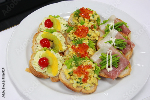 delicious canapes with egg, fish egg, salmon,asparagus and cream cheese