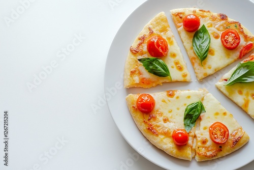 Delicious cauliflower crust keto pizza topped with fresh basil and cherry tomatoes, perfect for low-carb diet recipes. Concept showcases cauliflower crust keto pizza as healthy option