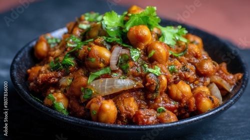 Delicious Chana Masala in a Black Bowl, Glistening With Tomato-Onion Gravy and Fresh Cilantro, Ready to Be Enjoyed for Dinner