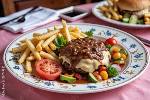 Delicious Cheeseburger Steak with Gravy French Fries and Fresh Salad Garnish