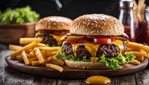burger, cheeseburger, hamburger, fries, french, fast, food, meal, dinner, lunch, tasty, delicious, savoury, cookery, american, junk, comfort, eatery, dining, eating, tomatoes, lettuce, onion, cheese, beef, meat, bread, bun, sesame, seed, ketchup, mustard, condiment, side, dish, crispy, salty, greasy, epicure, ravenous, craving, wood, plate, wooden