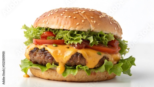 Delicious Cheeseburger with Fresh Lettuce, Tomato, and Melted Cheese, Isolated on a White Background Ideal for fast food branding and menu design.