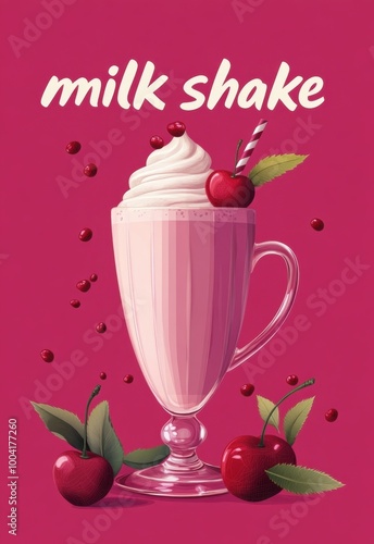 Delicious cherry milkshake illustration with whipped cream and floral decoration on a vibrant pink background, showcasing a refreshing dessert beverage with a playful design.