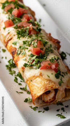 Delicious chicken and cheese enchilada topped with melted cheese, fresh tomatoes, and herbs on a white background