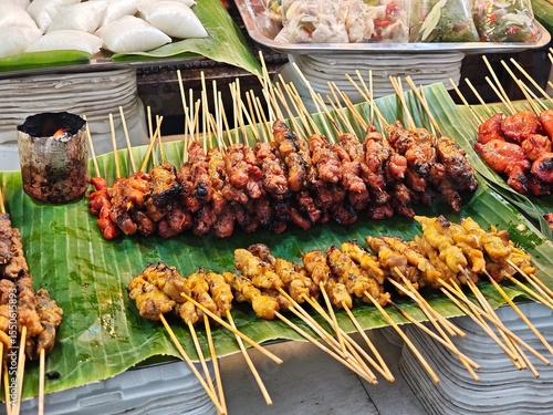 delicious chicken and meat satay on banana leave