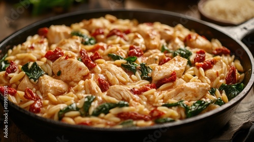 Delicious chicken orzo with sun-dried tomatoes and spinach in skillet